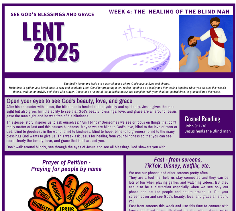 Lent is a sacred season that prepares our hearts for the joy of Easter. During these forty days, we are invited to draw closer to God through prayer, fasting, and giving. It is a time for families to reflect on God’s love, to simplify daily life, and to renew faith together. Lent reminds us that conversion begins in the heart and grows through acts of love and compassion in la familia and the wider community.